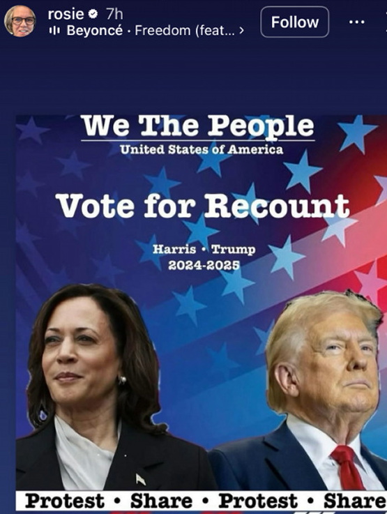 O’Donnell posted to her Instagram account, sharing a conspiracy-laced post by influencer Joe Braxton, who bizarrely claimed that Elon Musk “hacked and stole” the election. The duo’s solution? A good old-fashioned recount. Because nothing says “democracy” like ignoring reality eight months after the votes have been counted, verified, and certified.