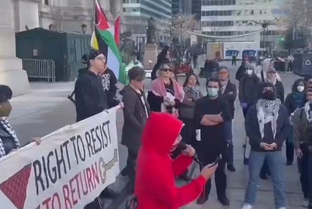 This was a crowd openly praising Hamas, Hezbollah, and the Houthis, three designated terrorist organizations, while burning American flags and waving Palestinian and Iranian flags in their place. In broad daylight. At City Hall.